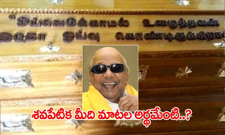 కరుణానిధిని ఉంచే శవపేటిక మీద తమిళంలో రాసి ఉన్న మాటలు ఇప్పుడు అందరి దృష్టినీ ఆకర్షిస్తున్నాయి. బంగారంతో పోత పోసిన శవపేటిక మీద ఇలా రాసి ఉంది. ‘విరామమన్నది ఎరుగక, నిరంతరం కృషి చేసిన వ్యక్తి ఇక్కడ విశ్రమిస్తున్నాడు’.. ఈ మాటలు కరుణానిధికి వర్తించినంత బాగా ఇంక ఎవరికి వర్తించవేమో. అందుకే శాశ్వత నిద్రలోకి జారుకుని విశ్రమిస్తోన్న ‘కలైజ్ఞర్’ శవపేటిక మీద ఈ మాటలనే చెక్కించారు. ఒకానొక సందర్భంలో కరుణానిధి తన కుమారుడు స్టాలిన్తో ‘మన సమాధి చూసిన జనాలు విశ్రాంతి అన్నది ఎరగకుండా పనిచేసిన వ్యక్తి ప్రస్తుతం ఇక్కడ సేద తీరుతున్నారని’ అనుకోవాలని చెప్పారట. ఈ మాటలు కరుణానిధికి సరిగ్గా సరిపోతాయి. అందుకే ఆయన శవ పేటికి మీద కొడుకు స్టాలిన్తో చెప్పిన మాటలనే తమిళంలో చెక్కించారు.