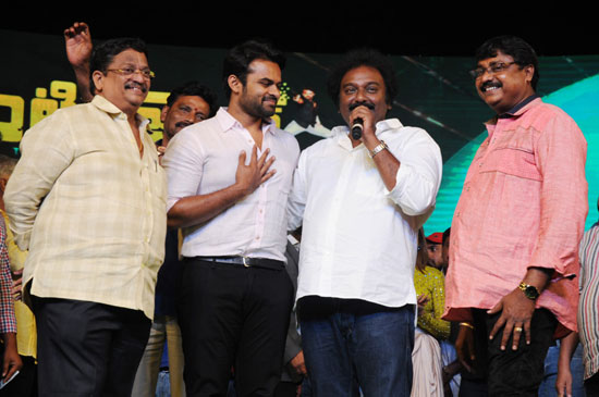 ఈ సందర్భంగా దర్శకుడు వి.వి.వినాయక్ మాట్లాడుతూ.. ‘‘ఈ వేదికపై నుంచి పవన్కల్యాణ్గారికి నాదో చిన్న విన్నపం. ‘సినిమాల్లో నటించను’ అన్నారు. సమస్యలపై ఎంత పోరాడినా, రాజకీయంగా ఎంత ఎదిగినా, మీకు సమయం దొరికినప్పుడల్లా ఈ అభిమానుల కోసం సినిమా చేయండి ప్లీజ్. సి.కల్యాణ్తో ఒక సోదరుడిలా కలిసి పనిచేశా. సినిమా కోసం ఆయన ఎక్కడా కాంప్రమైజ్ కాలేదు. సినిమా కోసం కష్టపడిన వారందరికీ ధన్యవాదాలు. తేజూకు తన స్టైల్ తనకున్నా.. ‘ఛమకు ఛమకు ఛాం’ చేస్తుంటే అన్నయ్య చిరంజీవే గుర్తొచ్చారు. కావాలని రెండు, మూడు షాట్లు పవన్కల్యాణ్ గుర్తొచ్చేలా తీశాను. వాళ్లిద్దరూ కలిస్తే ఎలా ఉంటుందో తేజూలో కనిపిస్తుంది. చిరంజీవిగారిలా పెద్ద స్టార్ అవుతాడు. నేను సహాయ దర్శకుడిగా ఉన్నప్పుడు నేను పెద్ద డైరెక్టర్ అవుతానని నమ్మినవాళ్లలో సి.కల్యాణ్ ఒకరు. నా గురువు సాగర్గారు ఇచ్చిన ప్రోత్సాహంతో మేము ఇక్కడ ఉన్నాం.’’ అని అన్నారు.