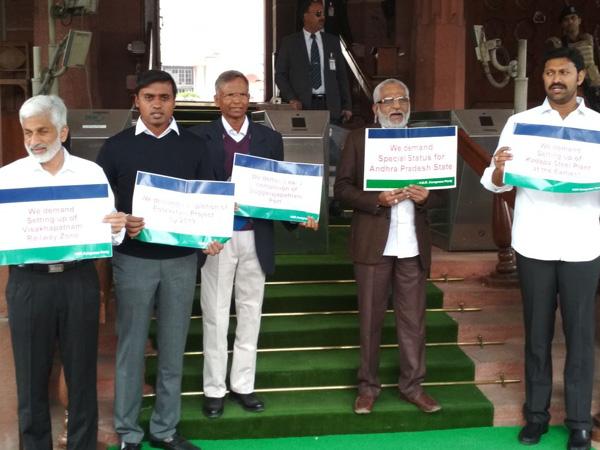 అటు విభజన చట్టంలోని పెండింగ్ అంశాలపై వైసీపీ పోరాటాన్ని కొనసాగిస్తోంది. ఇందులో భాగంగా వైఎస్ఆర్ సీపీ ఎంపీలు పార్లమెంట్ గేట్-1 దగ్గర నిరసన తెలిపారు. ఏపీకి ప్రత్యేక హోదా కావాలంటూ ఫ్లకార్డులు ప్రదర్శించారు. ఏపీకి ప్రత్యేక హోదాతో పాటు పోలవరం ప్రాజెక్ట్, విశాఖకు రైల్వే జోన్ ఏర్పాటు చేయాలంటూ నినాదాలు చేశారు. కడప స్టీల్ ప్లాంట్, దుగరాజపట్నం పోర్టుతో పాటు పోలవరం ప్రాజెక్ట్ను 2019 కల్లా పూర్తి చేయాలంటూ డిమాండ్ చేశారు. ఈ ఆందోళన కార్యక్రమంలో రాజ్యసభ సభ్యుడు విజయసాయి రెడ్డి, లోక్సభ ఎంపీలు మిథున్ రెడ్డి, వైవీ సుబ్బారెడ్డి, వరప్రసాద్, వైఎస్ అవినాష్ రెడ్డి పాల్గొన్నారు.