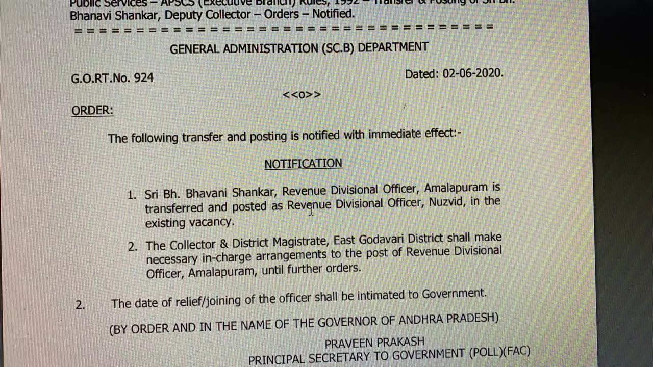 అమలాపురం రెవిన్యూ డివిజనల్ అధికారి బి హెచ్ భవాని శంకర్ ఆకస్మిక బదిలీ భవాని శంకర్ ను కృష్ణాజిల్లా నూజివీడు ఆర్టీవో గా బదిలీ చేస్తూ ఉత్తర్వులు