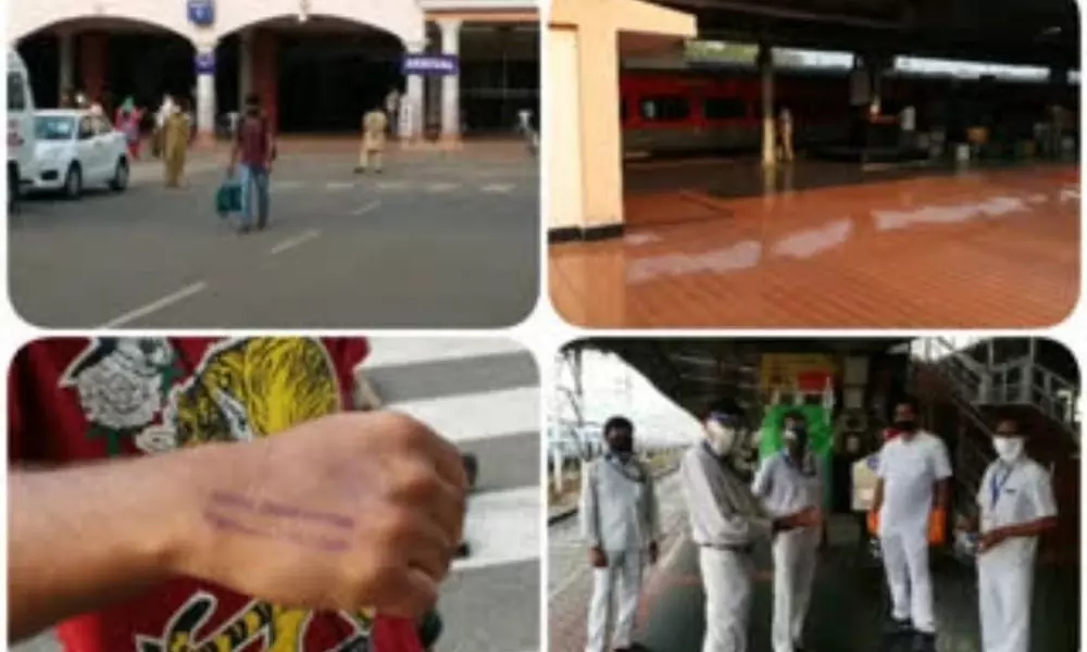 విశాఖపట్నం: హైద్రాబాద్ నుంచి విశాఖకు గోదావరి ఎక్స్ ప్రెస్ ప్రయాణికులతో చేరుకుంది. ప్రభుత్వం నిబంధనల ప్రకారం రాష్ట్రానికి వచ్చిన ప్రయాణికులకు... రైల్వే స్టేషన్ లోపలే కోవిడ్ పరీక్షలు నిర్వహిస్తున్నారు. వారి చేతికి హోమ్ క్వారంటైన్ ముద్ర వేసి పంపుతున్నారు. ప్రయాణికుల రైళ్లు వచ్చే ముందు... వాల్తేర్ రైల్వే పోలీసులు కట్టుదిట్టమైన చర్యలు తీసుకుంటున్నారు. వారు గేట్ నెంబర్- 1 ద్వారా బయటకు వచ్చేలా ఏర్పాటు చేశారు. అధికారులు బస్సులు, ప్రైవేట్ వాహనాలను రైల్వే స్టేషన్ గేట్ వెలుపలే ఏర్పాటు చేశారు. కేవలం బయటకు వచ్చే ప్రయాణికులు తప్ప మరెవ్వరూ ప్లాట్ ఫామ్పై ఉండకుండా చర్యలు తీసుకున్నారు. విశాఖ నుంచి బయట ఊళ్లకు వెళ్లే వారికి జ్ఞానాపురం వైపు నుంచి ప్రవేశం కల్పిస్తున్నారు.