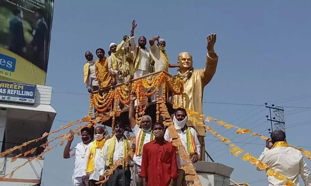 కరీంనగర్ టౌన్: తెలుగుదేశం పార్టీ వ్యవస్థాపకులు నందమూరి తారక రామారావు జయంతి వేడుకలను, కరీంనగర్ లో ఘనంగా నిర్వహించారు. ఎన్టీఆర్ విగ్రహానికి పూలమాలలు వేసిన పార్లమెంటరీ అధ్యక్షులు అంబటి జోజి రెడ్డి. అనంతరం వారు మాట్లాడుతూ... ఎన్టీఆర్ బడుగు బలహీన వర్గాల కోసం అహర్నిశలు పనిచేశారని కొనియాడారు. నాడు పేదలకోసం రెండు రూపాయలకే కిలో బియ్యం పథకాన్ని ప్రవేశపెట్టి, ఎంతోమంది పేదల కడుపులు నింపారని అన్నారు. ఆయన పెట్టిన మహానాడు ఇప్పటికి కూడా నడుస్తుందని, 38వ మహానాడు కార్యక్రమాన్ని కరీంనగర్ లో నిర్వహిస్తున్నామని తెలిపారు. టీఆర్ఎస్ పార్టీకి గట్టిపోటీని ఇచ్చి, ప్రజలకు న్యాయం జరిగే వరకూ పోరాటం చేసే పార్టీ తెలుగుదేశం పార్టీ మాత్రమేనని ఆయన అన్నారు. ఎక్కడ అన్యాయం జరిగినా న్యాయం జరిగే వరకూ తెలుగుదేశం పార్టీ కార్యకర్తలు నిలదీసి న్యాయం జరిగే వరకూ పోరాటం చేయాలని పిలుపునిచ్చారు.