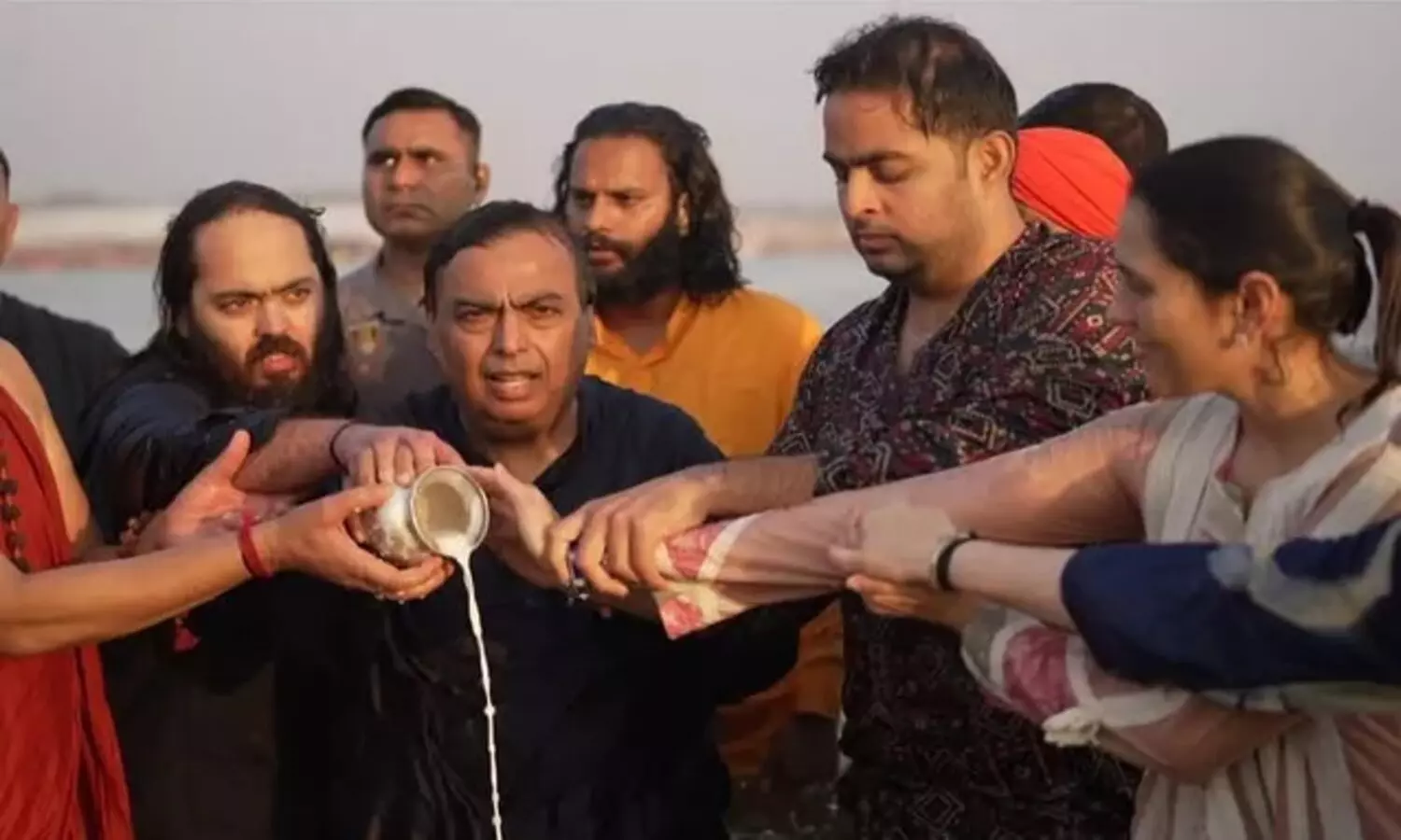 ముకేశ్ అంబానీ నాలుగు తరాలతో మహా కుంభ నగర్ కు వచ్చారు. ముఖేష్ అంబానీ మనవరాళ్ళు పృథ్వీ, వేదలతో పాటు ఆయన తల్లి కోకిలాబెన్, కోడళ్ళు ఆకాష్-శ్లోక, అనంత్-రాధిక కూడా హాజరయ్యారు. సంగమంలో స్నానం చేసిన తర్వాత, అంబానీ కుటుంబం నిరంజని అఖాడా అధిపతి ఆచార్య మహామండలేశ్వర్ స్వామి కైలాశానంద గిరి జీ మహారాజ్ సమక్షంలో గంగానదిని పూజించారు. స్నానం తర్వాత, కుటుంబం పరమార్థ్ నికేతన్ ఆశ్రమానికి చేరుకుని, శుభ్రపరిచేవారికి, నావికులకు, యాత్రికులకు స్వీట్లు పంపిణీ చేసింది. కుటుంబ సభ్యులు యాత్రికులకు ఆహార ప్రసాదాలను కూడా పంపిణీ చేశారు.