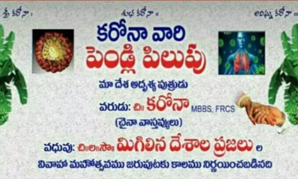 కరోనా వల్ల ప్రజలు ఇంటి నుండి బయటకు రావాలంటేనే భయపడుతున్నారు. కరోనా వైరస్ వ్యాపిస్తున్నది. అంతకు మించిన వేగంతో సోషల్ మీడియాలో సెటైర్లు, కామెంట్లు వ్యాపిస్తున్నాయి. ఇదే సమయంలో సోషల్ మీడియాలో కరోనా పెండ్లి పిలుపు పేరుతో ఒక పెళ్లి పత్రిక తెగ వైరల్ అవుతోంది. ఈ పెళ్లి పత్రికను ఎవరు రూపొందించారో తెలీదు కానీ చాలా ఫన్నీగా చదివితే నవ్వొచ్చే విధంగా రూపొందించారు.