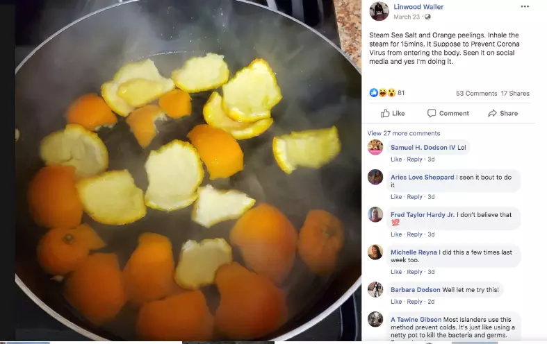ఓ ఫేస్బుక్ యూజర్.. సముద్రపు నీటిలో ఆరెంజ్ తొక్కలు వేడి చేసే వీడియోను పోస్ట్ చేసి 15 నిమిషాలు ఆవిరి పీల్చాలని సూచించారు.. అందువల్ల కరోనా వైరస్ శరీరంలోకి రాకుండా నిరోధిస్తుందని నేను చేశాను మీరు కూడా చేయండని పోస్టులో పేర్కొన్నారు. దీంతో ఈ వీడియో వైరల్ అయింది.
