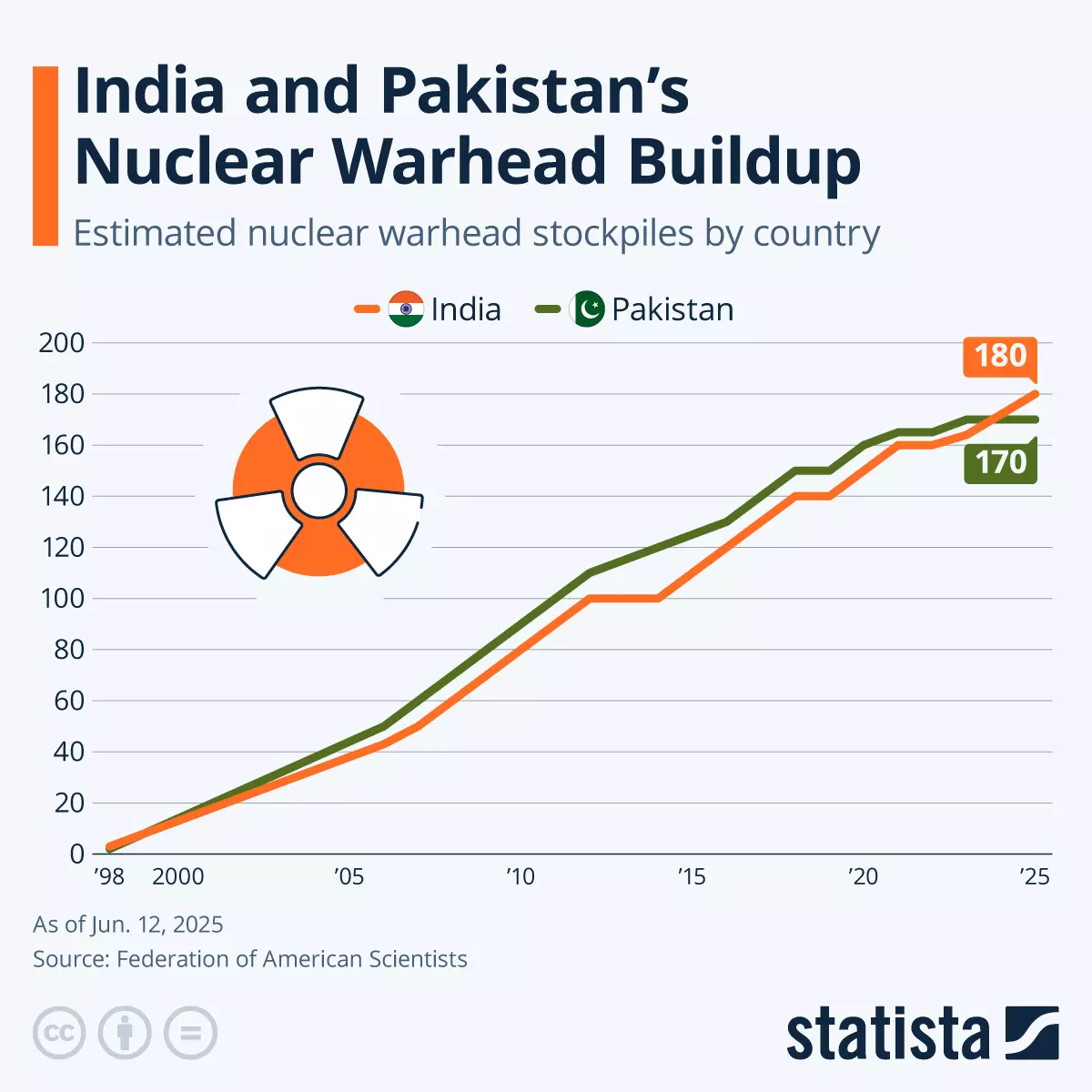 మిత్రరాజ్యాల నుంచి పొరుగు దేశాల వరకు: FAS నివేదిక ప్రకారం, 2025 నాటికి భారత్ వద్ద ఉన్న అణు వార్హెడ్ల సంఖ్య 180కి చేరుకుంది. గత ఏడాది ఈ సంఖ్య 172గా ఉండగా, కేవలం ఏడాది కాలంలోనే భారత్ మరో 8 వార్హెడ్లను అదనంగా సమకూర్చుకుంది. మరోవైపు పాకిస్థాన్ వద్ద అణ్వస్త్రాల సంఖ్య 170 వద్దే స్థిరంగా కొనసాగుతోంది.