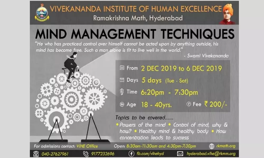 అందులో భాగంగా రామకృష్ణ మఠంలోని వివేకానంద ఇన్స్టిట్యూట్ ఆఫ్ హ్యూమన్ ఎక్సెలెన్స్ క్లాసులు నిర్వహిస్తుంది. మనిషి ఏకాగ్రత కోల్పోకుండా ఉండడం సామర్థ్యాన్ని తెలుసుకోవడం ఏలా అనే దానిపై శిక్షణ తరగతులు నిర్వహిస్తుంది. మనస్సును ప్రశాంతంగా ఉంచుకోవడం, ఆలోచనలు కంట్రోల్ చేసుకోవడం వంటి వాటి మీద శిక్షణ ఇస్తారు. హైదరాబాద్ ఇందిరాపార్క్ వద్ద ఉన్న రామకృష్ట మఠంలో ఈ శిక్షణ తరగతులు నిర్వహిస్తారు.