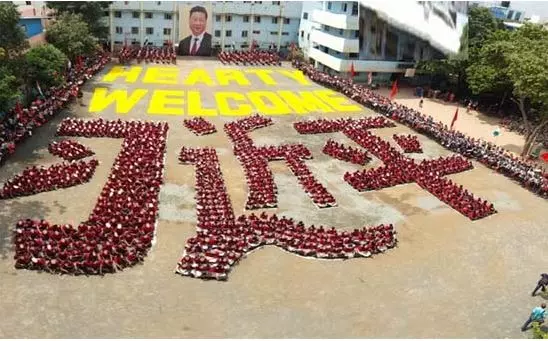 చైనా అధ్యక్షుడు షి జిన్పింగ్ రెండు రోజుల పర్యటనలో భాగంగా భారత్ లో పర్యటించారు. ఈ సందర్భంగా ఆయనకు చైన్నైలోని ఓ ప్రముఖ పాఠశాలకు చెందిన విద్యార్ధులు వినూత్న రీతిలో స్వాగతం పలికారు.
