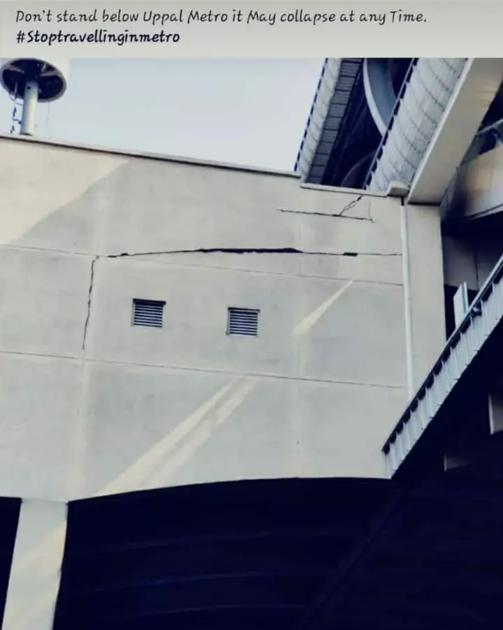 ఈ క్రమంలోనే ఉప్పల్ మెట్రో స్టేషన్ వద్ద పరిస్థితిని ఒక ఔత్సాహికుడు ఫోటో తీసి సామాజిక మాధ్యమాల్లో పోస్ట్ చేశారు. ఆ ఫోటోలో అతి ప్రమాదకరమైన పగుళ్ళు ఉప్పల్ మెట్రో స్టేషన్ గోడలపై కనిపించాయి. అవి చూడటానికి సాధారణ పగుళ్ళుగా కనిపించలేదు. ప్లాస్టింగ్ లో పగుళ్లుగా ఏ మాత్రం కనిపించడం లేదు. దీంతో మెట్రో ప్రమాదకరంగా ఉందంటూ ఆ వ్యక్తీ ఫోటోకి క్యాప్షన్ ఇచ్చారు. ఇది వైరల్ గా మారింది. ఈ ఫోటో రెండు రోజులుగా సామాజిక మాధ్యమాలలో చక్కర్లు కొడుతోంది.