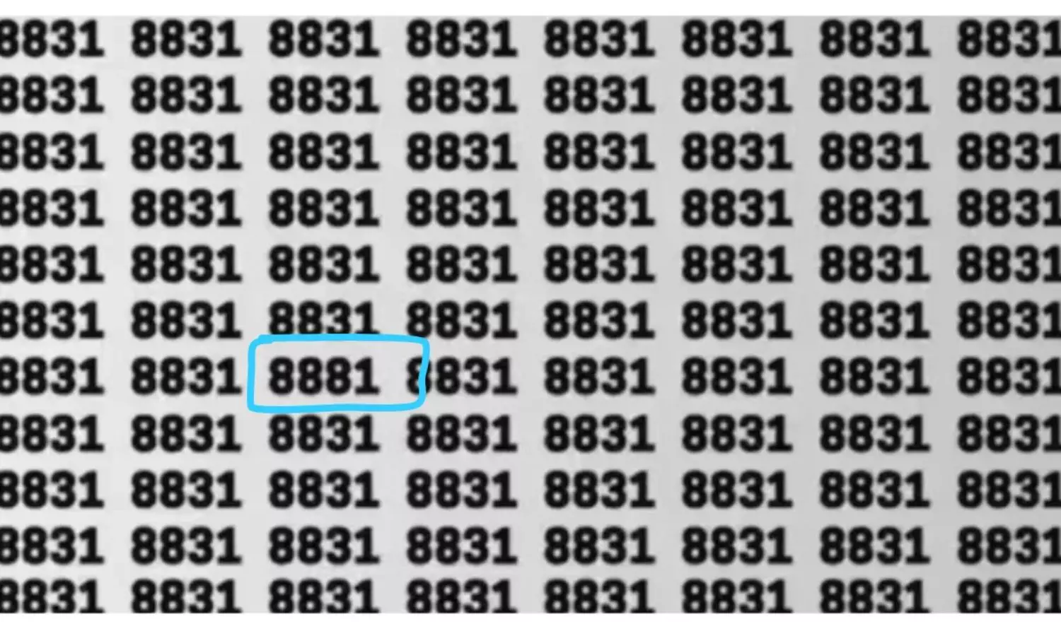 పైన కనిపిస్తున్న ఫొటో చూడగానే '8831' అనే నెంబర్ కనిపిస్తోంది కదూ! అన్ని నెంబర్స్ ఒకేలా ఉన్నా ఇందులో ఒక్క నెంబర్ మాత్రం తేడాగా ఉంది. ఆ తేడాగా నెంబర్ను గుర్తించడమే ఈ ఆప్టికల్ ఇల్యూజన్ ముఖ్య ఉద్దేశం. ఇంతకీ ఈ డిఫ్రెంట్ నెంబర్ ఏంటంటే.. '8881'. ఈ నెంబర్ కూడా ఇందులోనే దాగి ఉంది.