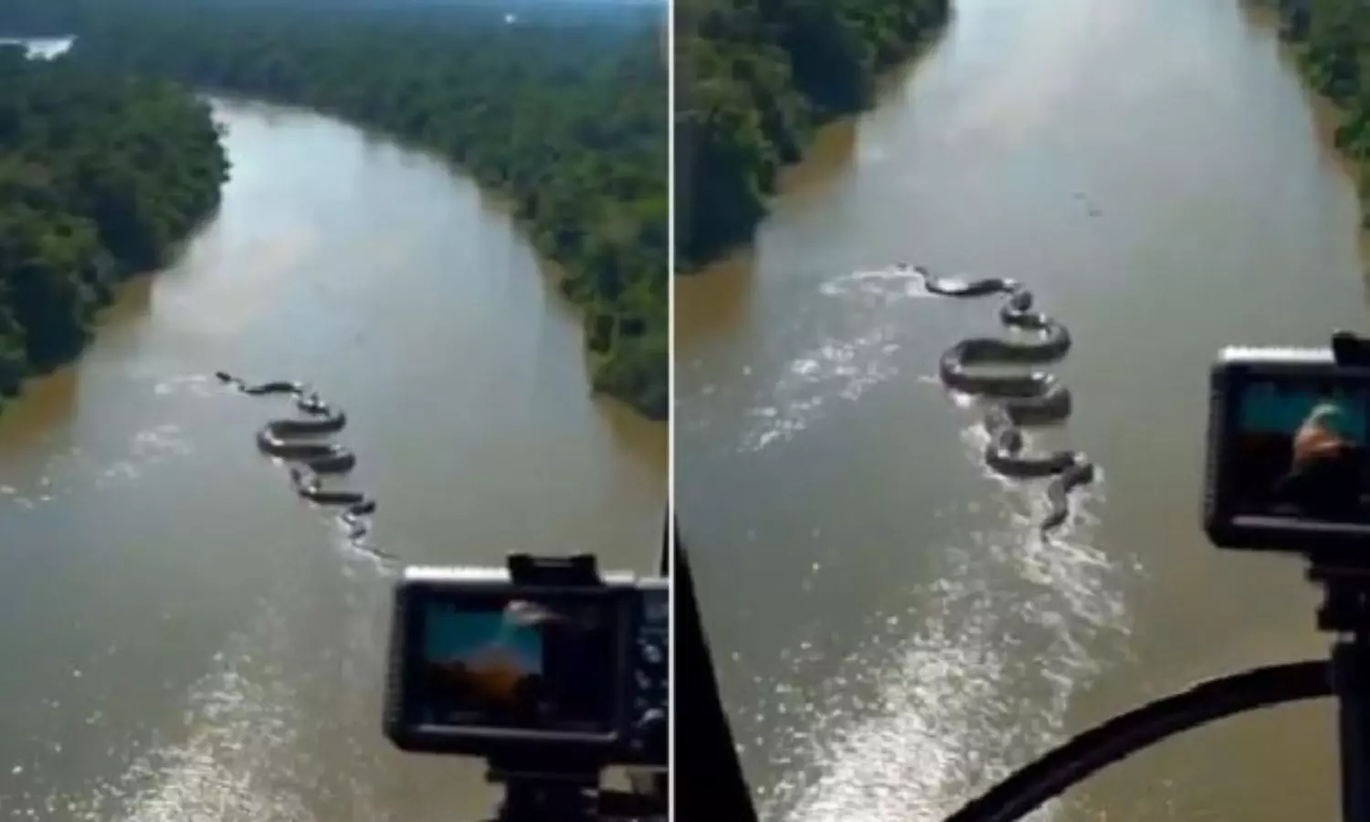 దట్టమైన అమెజాన్ అడవి మధ్య ఓ నదిలో ఓ భారీ అనకొండ ఈదుకుంటూ వెళ్తున్న వీడియో ఇప్పుడు సోషల్ మీడియాలో వైరల్ అవుతోంది. హెలికాఫ్టర్ నుండి ఈ దృశ్యాన్ని చిత్రీకరించినట్టు స్పష్టమవుతోంది. అనకొండ నీటిలో ఈదుతూ వెళ్లడం, దాని భారీ శరీర ఆకారం నెటిజన్లను ఆశ్చర్యంలో ముంచెత్తుతోంది.