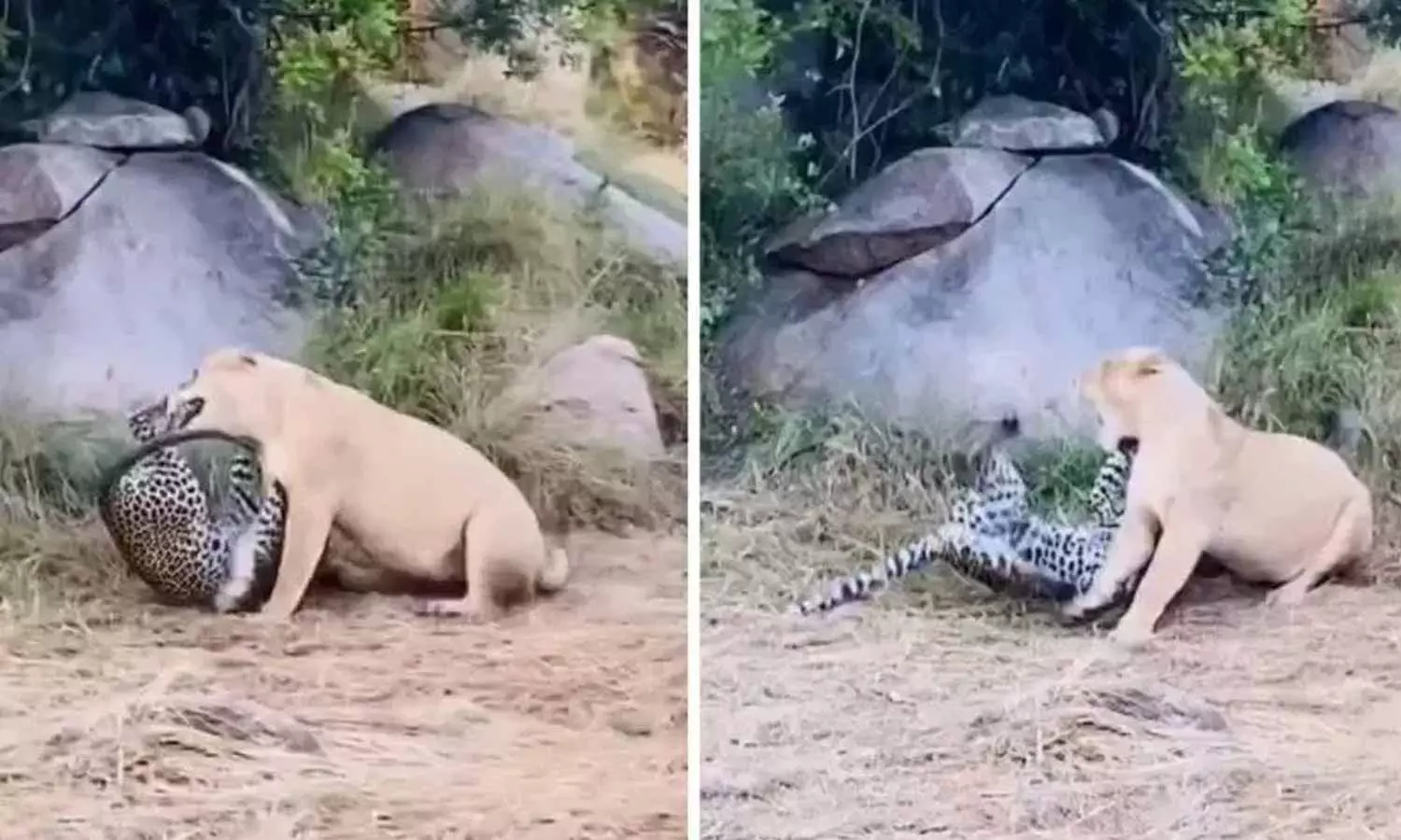 దానికే తెలియకుండా సింహ దగ్గరవరకు ఓ చిరుత వెళ్లిపోయింది. తీరా చూసే లోపే సింహ చిరుతపై ఎటాక్కు దిగింది. రెండు, మూడు సెకన్లలో వీటి మధ్య పోరాటం తీవ్రం అయిపోయింది. వేగంలో చిరుత, బలంలో సింహం. రెండూ తెలివైనవే. కానీ సింహం బలం ముందు చిరుత ఎందుకు పనికిరాదు. ఎందుకంటే అది చాలా సన్నగా ఉంది. సింహం బలంగా ఉంది. కానీ విచిత్రం ఏంటంటే.. చిరుత సింహంతో పాటుగా పోరాడింది. చిరుత నేలపైన పడిపోయినప్పటికి తేలికైన శరీరాన్ని ఉపయోగించుకుని సింహంపై ఎదురుదాడికి దిగింది.