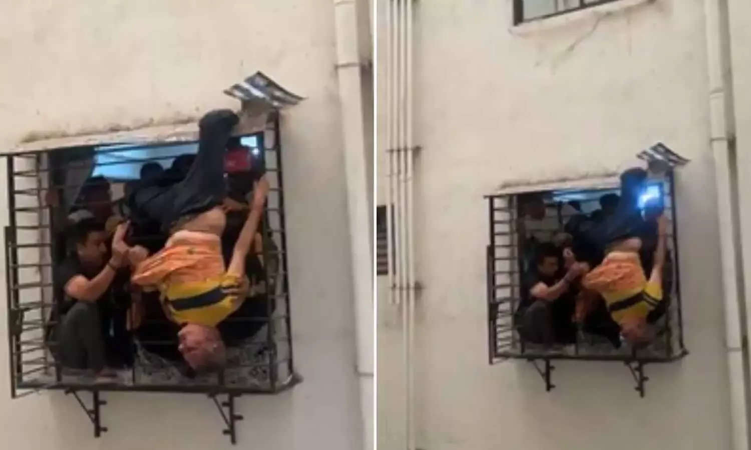 సూరత్ జహంగీరాబాద్ ప్రాంతంలోని ఓ అపార్ట్మెంట్లో నివసిస్తున్న నితిన్ ఆదిత్య (57) తన గదిలో నిద్రిస్తున్న సమయంలో పొరపాటున కిటికీ వైపు జారిపడి కిందకు పడిపోయాడు. అయితే అదృష్టవశాత్తు అతను ఎనిమిదో అంతస్తు కిటికీలో తలకిందులుగా చిక్కుకున్నాడు. దాదాపు గంటపాటు నరకయాతన అనుభవిస్తూ అక్కడే వేలాడుతూ ఉండిపోయాడు.