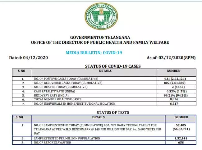 తెలంగాణ రాష్ట్రంలో గత కొద్ది రోజులుగా కరోనా కేసులు తగ్గుముఖం పట్టాయి. తాజాగా గడిచిన 24 గంటల్లో 631 కరోనా కేసులు నమోదు కాగా.. ఇద్దరు మృతి చెందారు. దీంతో మొత్తం ఇప్పటి వరకు రాష్ట్రంలో పాజిటీవ్ కేసుల సంఖ్య 2,72,123కి చేరింది. 1,467 మంది మరణించారు. కరోనాబారి నుంచి నిన్న 802 మంది కోలుకున్నారు. దీంతో ఇప్పటివరకు కోలుకున్న బాధితుల సంఖ్య 2,61,830కి చేరింది. రాష్ట్రంలో ప్రస్తుతం 8,826 యాక్టివ్ కేసులు ఉన్నాయని, వారిలో 6,812 మంది హోం ఐసోలేషన్లో చికిత్స పొందుతున్నారని వైద్య ఆరోగ్యశాఖ తెలిపింది. గడిచిన 24 గంటల్లో 57,405 మందికి కరోనా నిర్థారణ పరీక్షలు నిర్వహించగా, ఇప్పటి వరకు తెలంగాణలో నిర్వహించిన కరోనా నిర్థారణ పరీక్షల సంఖ్య 56,05,306కి చేరింది.