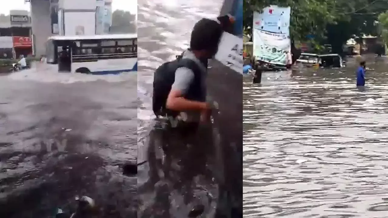 అమీర్పేట్ మెట్రో స్టేషన్ చుట్టుపక్కల భారీగా నీరు నిలిచిపోయింది. రోడ్డుపై సుమారు నడుంలోతు నీళ్లు ఉండటంతో వాహనదారులు తీవ్ర ఇబ్బందులు ఎదుర్కొన్నారు. వర్షానికి సంబంధించి తీసిన వీడియోలు సోషల్ మీడియాలో విపరీతంగా వైరల్ అవుతున్నాయి.