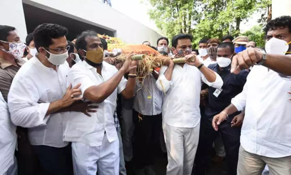 టీఆర్ఎస్ నేత, మాజీ హోం శాఖ మంత్రి నాయిని నర్సింహారెడ్డి ఆనారోగ్య సమస్యలతో బాధపడుతూ ఈ రోజు మృతి చెందిన సంగతి తెలిసిందే. ఇక జూబ్లీహిల్స్ మహాప్రస్థానంలో నాయిని అంత్యక్రియలు జరుగుతున్నాయి.. అయన అంత్యక్రియలకి టీఆర్ఎస్ పార్టీ సీనియర్ నాయకులు, మంత్రులు, ఎమ్మెల్యేలు, ఎమ్మెల్సీలు, ఎంపీలతో పాటు పార్టీ నాయకులు హాజరయ్యారు. అధికారిక లాంఛనాలతో అంత్యక్రియలు నిర్వహిస్తోంది తెలంగాణ ప్రభుత్వం.. అయితే అంత్యక్రియల్లో భాగంగా నాయిని పాడెను మంత్రులు కేటీఆర్, శ్రీనివాస్గౌడ్ మోశారు. నాయిని చివరి చూపు చూసేందుకు అభిమానులు, పార్టీ కార్యకర్తలు భారీ సంఖ్యలో తరలివచ్చారు.