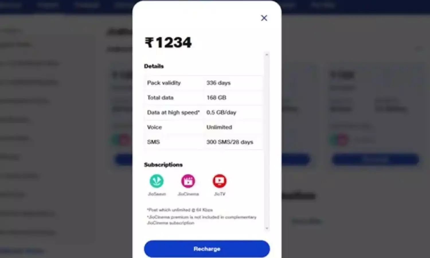 ఈ రీఛార్జ్ ప్లాన్ ముఖ్యంగా డేటా కంటే ఎక్కువ వ్యాలిడిటీ, కాలింగ్ అవసరమైన వారిని దృష్టిలో ఉంచుకుని ప్రవేశపెట్టింది. ఈ ప్లాన్ ద్వారా మీకు ఏకంగా 336 రోజుల వ్యాలిడిటీ లభిస్తుంది. ఈ ప్లాన్‌లో భాగంగా ప్రతిరోజూ 0.5GB హై-స్పీడ్ డేటా లభిస్తుంది. అంటే మొత్తం ప్లాన్ వ్యాలిడిటీ కలిపి 168GB డేటా అందుబాటులో ఉంటుంది. డైలీ కోటా ముగిసిన తర్వాత ఇంటర్నెట్ వేగం 64kbpsకి తగ్గుతుంది. ఈ ప్లాన్‌లో భాగంగా అపరిమిత వాయిస్ కాలింగ్‌తో పాటు, ప్రతి 28 రోజులకు 300 SMSలు ఉచితంగా లభిస్తాయి. దీని అదనపు ప్రయోజనాల విషయానికి వస్తే.. జియో సావన్, జియో టీవీ యాప్స్‌కు ఉచిత యాక్సెస్ లభిస్తుంది.