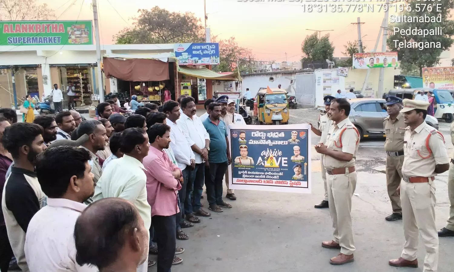 Sultanabad: ప్రమాద రహిత సమాజం కోసం ప్రతి ఒక్కరూ ట్రాఫిక్ నిబంధనలు పాటించాలని సుల్తానాబాద్ పోలీసులు పిలుపునిచ్చారు. 'అరైవ్ అలైవ్' (Arrive Alive) క్యాంపెయిన్లో భాగంగా శనివారం సుల్తానాబాద్లోని ప్రధాన కూడలి అయిన అంబేద్కర్ చౌరస్తాలో భారీ ట్రాఫిక్ అవగాహన కార్యక్రమాన్ని నిర్వహించారు.