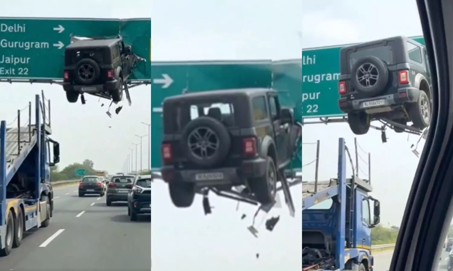 హైవేపై సైన్ బోర్డులో చిక్కుకుని గాల్లో వేలాడుతున్న థార్ జీప్ వీడియో వైరల్ అవుతోంది. అందర్నీ ఆశ్చర్యపరుస్తున్న ఆ వీడియో వెనుక ఉన్న నిజం తెలిస్తే అవాక్కవుతారు